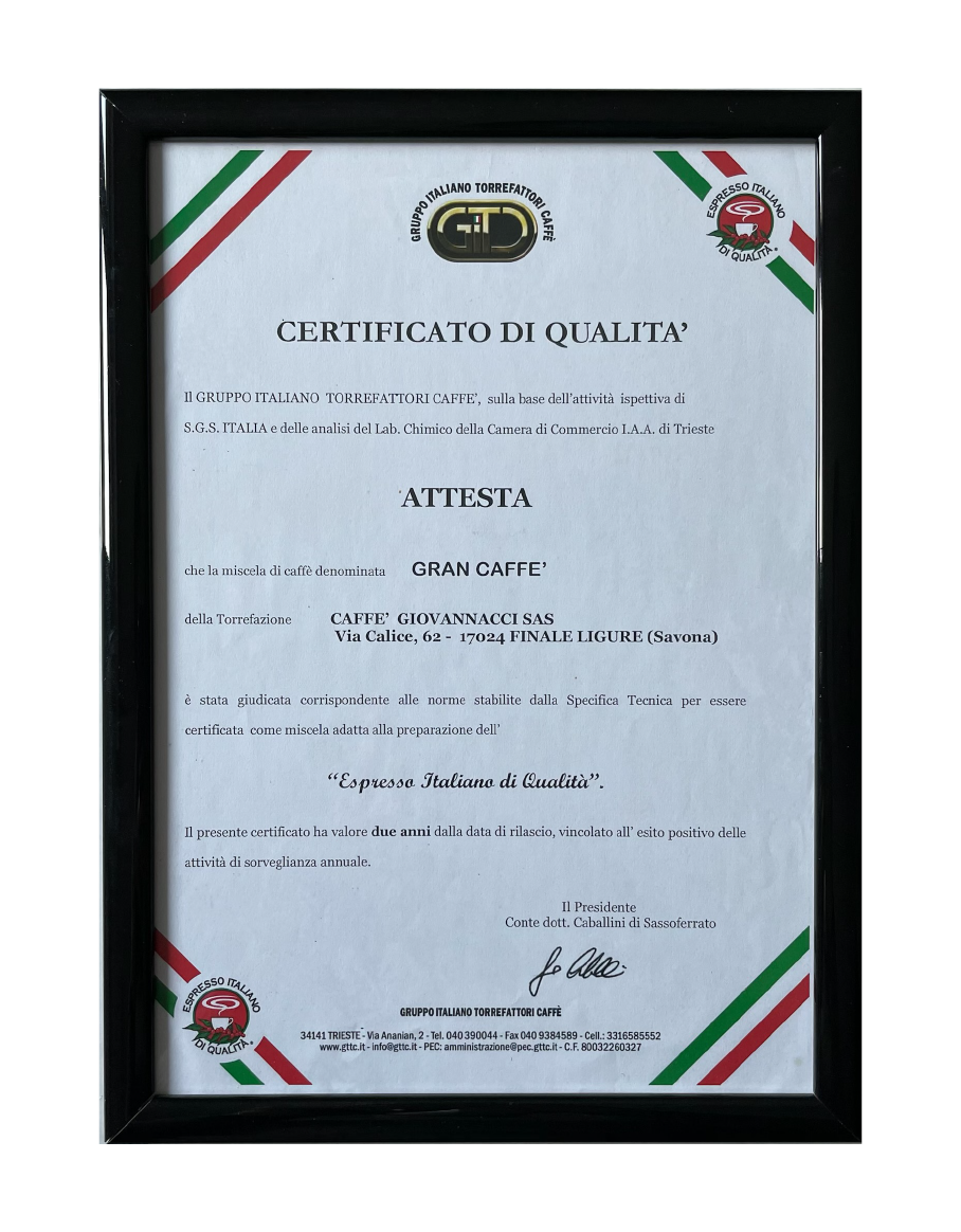 Wir erhalten das Qualitätszertifikat 'Certificato Espresso Italiano' von der Gruppo Triveneto Torrefattori